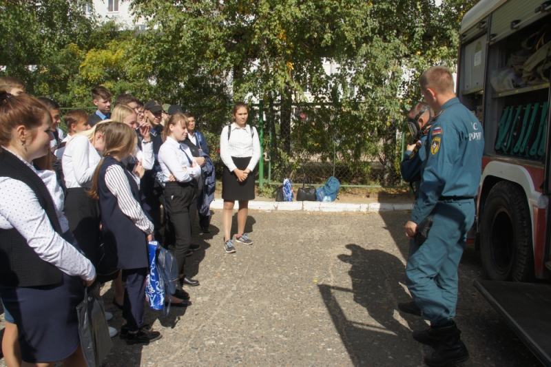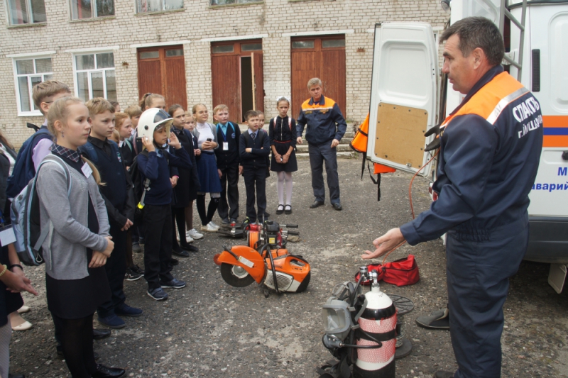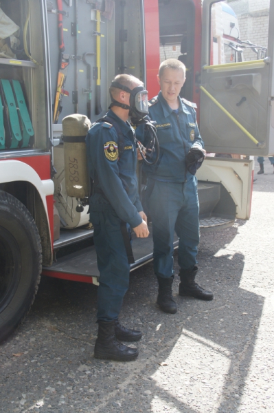 Затем ученики начальных классов отправились в актовый зал, где посмотрели обучающие мультфильмы и пообщались с представителем государственного пожарного надзора на тему пожарной безопасности. Школьники постарше участвовали в практическом занятии, проведенном огнеборцами из пожарно-спасательной части. Ребята получили возможность увидеть пожарную технику и снаряжение, примерить аппараты со сжатым воздухом и маски для работы в непригодной для дыхания среде.