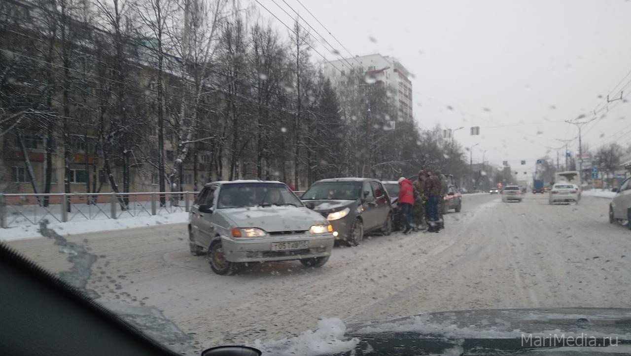 Неделя в Йошкар-Оле началась со столкновений. Снег внёс свои коррективы в дорожное движение. На улице Карла Маркса около перекрёстка с Успенской произошло массовое ДТП.