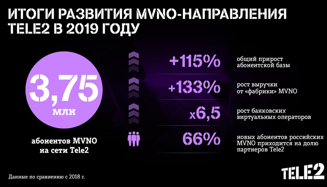 За последние три года Tele2 стала настоящей «фабрикой» MVNO. Всего на сети Tele2 сейчас работает больше 20 виртуальных операторов. Общее число их абонентов в 2019 году выросло на 115% до 3,75 млн. Выручка Tele2 от «фабрики» MVNO увеличилась на 133% год к году.