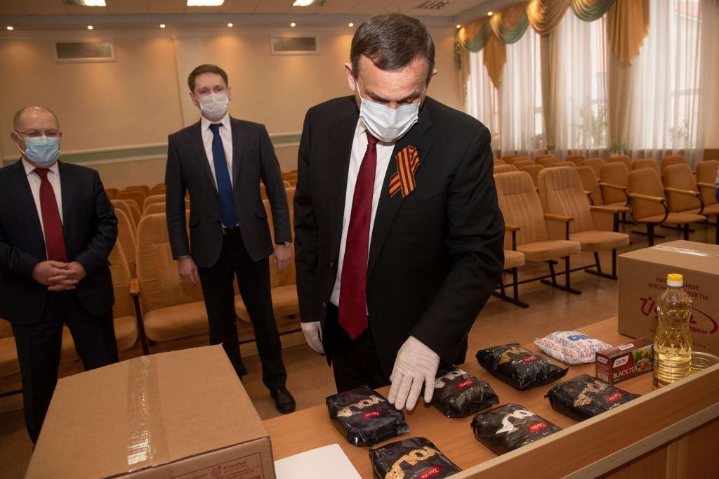 Глава региона посетил посёлок Советский, куда уже поступили 860 таких продуктовых наборов, каждый из которых весит 8 кг.