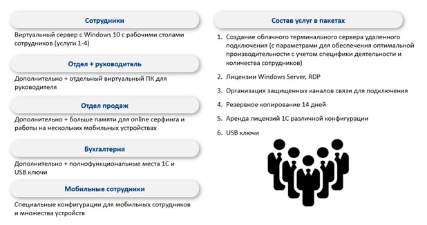 Также в рамках сервиса «Виртуальный офис под ключ» клиентам предлагаются дополнительные опции — подключение системы отслеживания утечек информации, шифрование каналов связи (сертифицированные алгоритмы шифрования ГОСТ VPN), комплексная защита компьютеров сотрудников от вредоносного ПО, аренда лицензий MS Office, 1C, IT- аутсорсинг (настройка приложений, ОС) внутри ОС клиента, а также аренда ресурсов GPU.