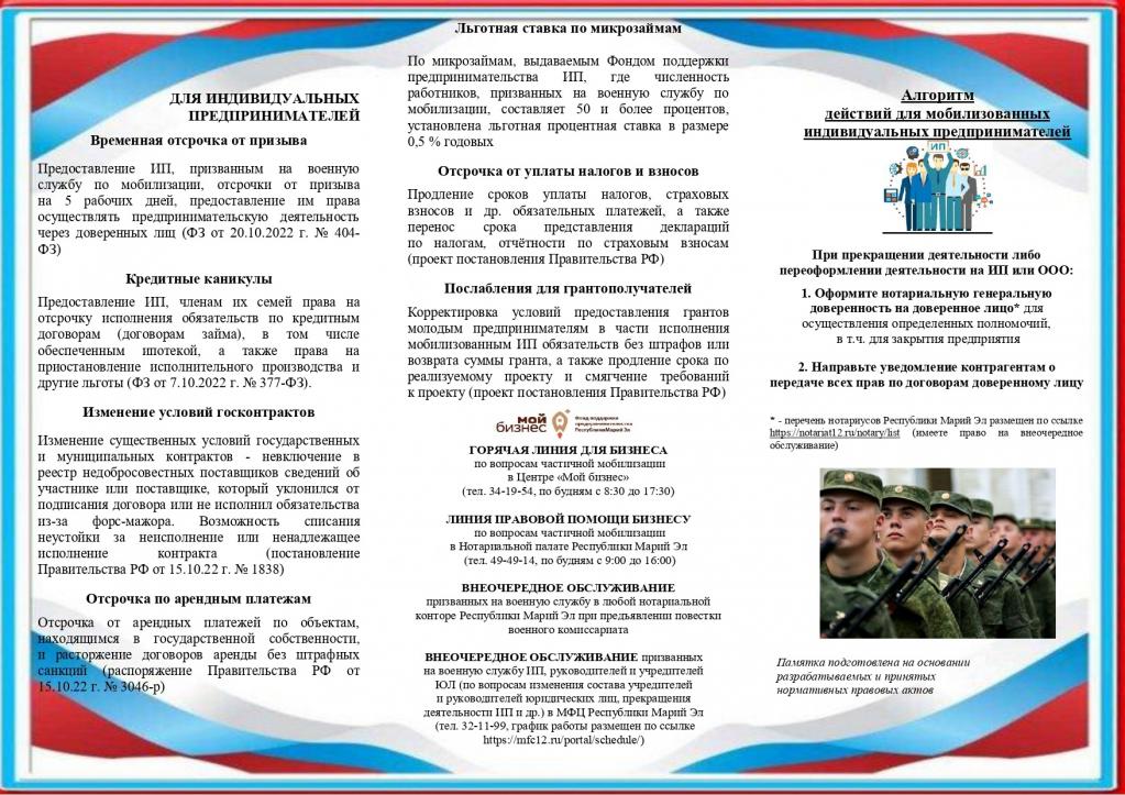 В Йошкар-Оле для удобства мобилизованных предпринимателей и их семей подготовили памятку. В ней собрана вся актуальная информация для представителей бизнеса в условиях частичной мобилизации.