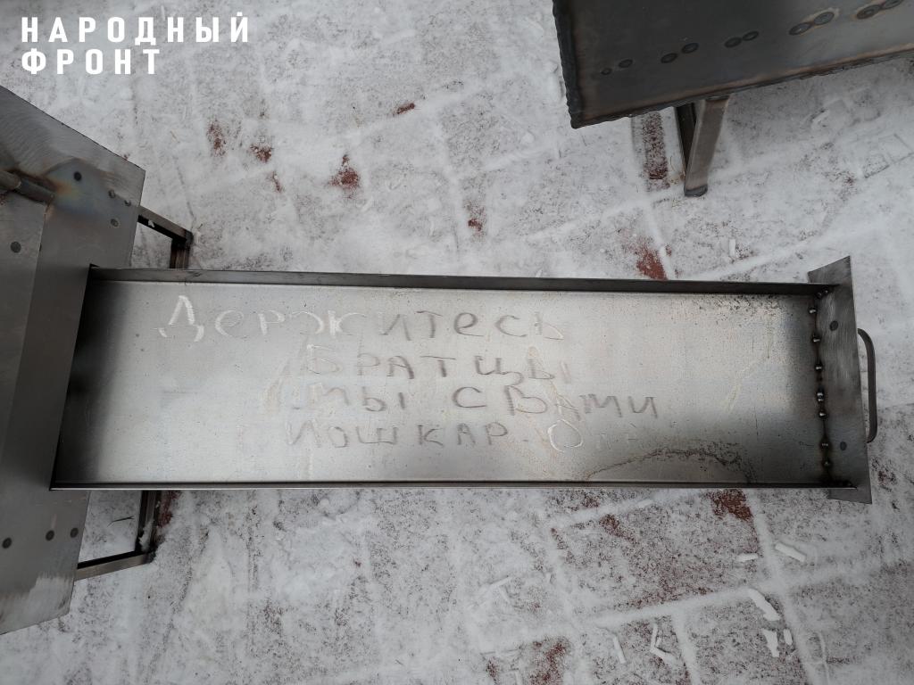 Надо отметить, что организация бизнесмена специализируется на выпуске металлических дверей. Для изготовления печей здесь решили слегка переформатировать производство. Тем более необходимый материал для обогревателей был в наличии. Когда изделия были готовы, на некоторых из них работники нацарапали слова поддержки: «Держитесь, братцы! Мы с вами! Город Йошкар-Ола».