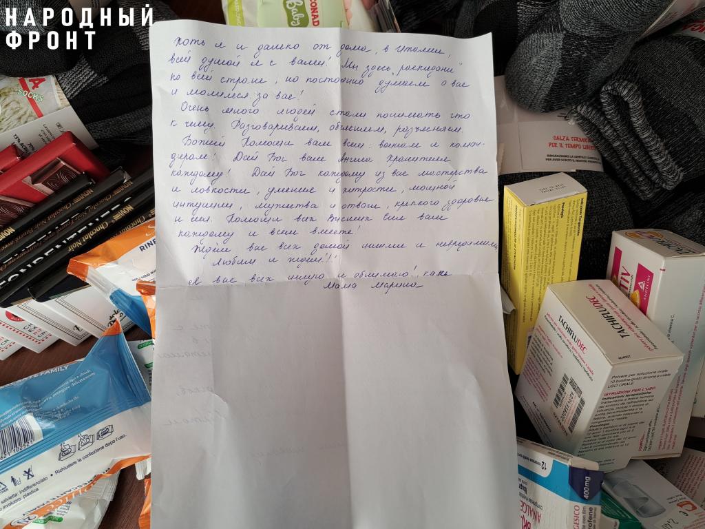 «Сыночки, родные! Хоть я и далеко от дома, в Италии, всей душой я с вами! Мы здесь „раскиданы“ по всей стране, но постоянно думаем о вас и молимся за вас! Божьей помощи вам всем: воинам и командирам! Ждём вас всех домой целыми и невредимыми. Любим и ждём! Я вас всех целую обнимаю! Как мама Марина», — написала она в сопроводительном письме.