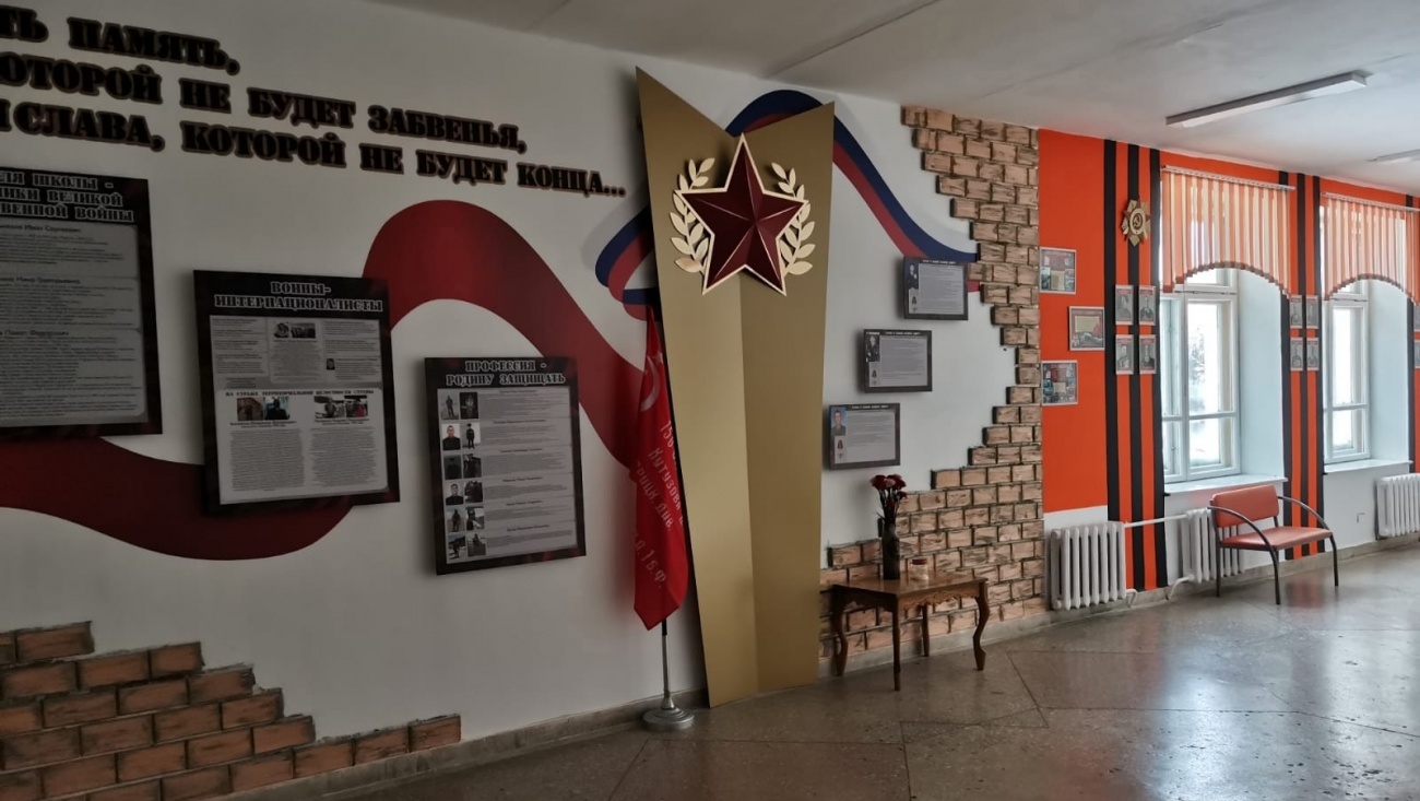 На стене представлено несколько блоков: выпускники школы — участники Великой Отечественной Войны, воины — интернационалисты, на страже территориальной целостности страны.