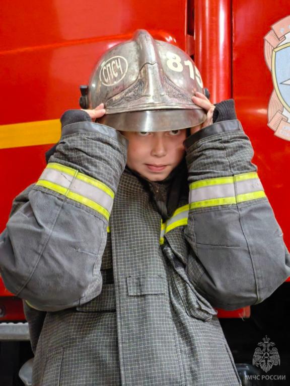 Михаил Михайлович рассказал о работе пожарной части, показал специальное газодымозащитное оборудование, продемонстрировал боевую одежду пожарного. Семья героя ознакомилась также с пожарно-техническим вооружением, а сын примерил боевую одежду пожарного.