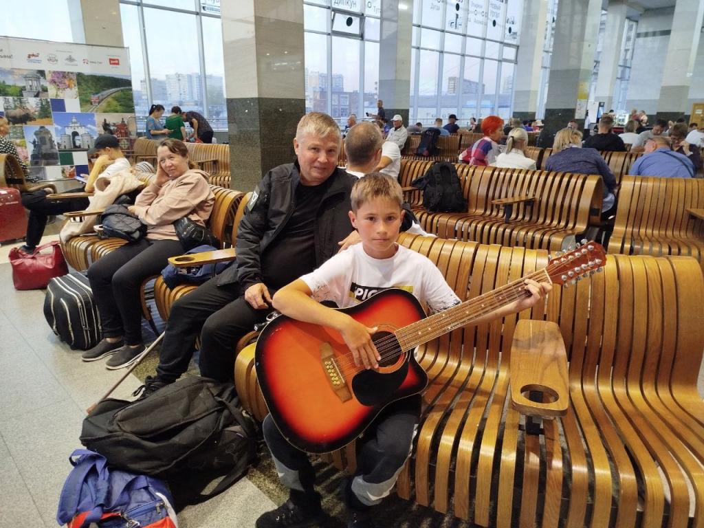 В ожидании поезда подопечные марийского филиала фонда «Защитники Отечества» не теряли времени зря. Брат Героя России Дамира Шаймарданова Эльман постигал игру на гитаре. Инструмент взял с собой боец Игорь Иванов.