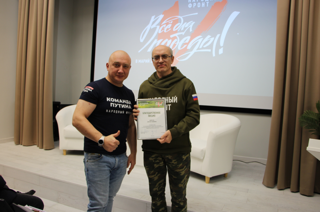 В рамках проекта «Всё для Победы!» Народным фронтом по поручению президента ведётся работа по сбору и доставке гуманитарной помощи бойцам-землякам, жителям освобожденных территорий и приграничных территорий России. Правительство республики участвует в программе, оказывая помощь нашим бойцам в зоне СВО, так, по поручению главы Марий Эл Юрия Зайцева была приобретена дизельная генераторная станция для танкистов.