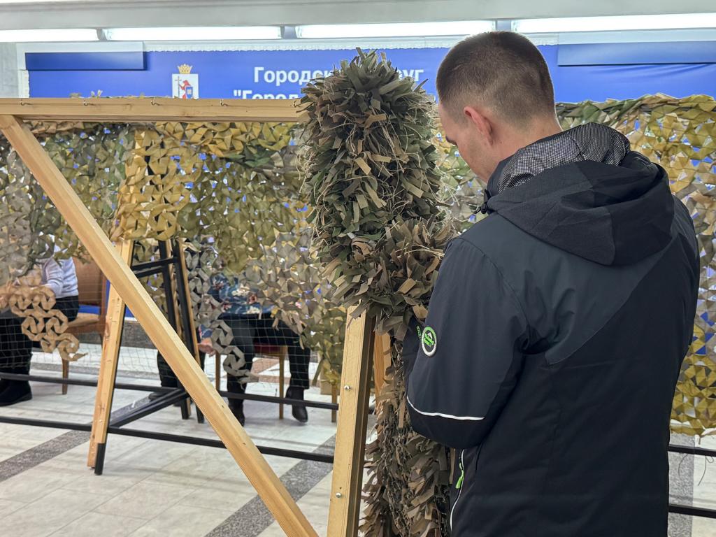 Он также пообщался с волонтёрами, которые в администрации города занимаются изготовлением камуфляжных изделий, и даже примерил первую снайперскую накидку.