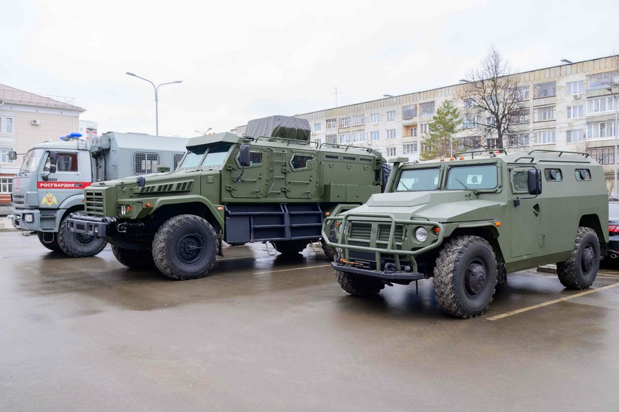 Перед началом мероприятия Юрий Зайцев и начальник Управления Росгвардии Марий Эл Александр Голуб осмотрели выставку специальной и военной техники, средств бронезащиты и вооружения.