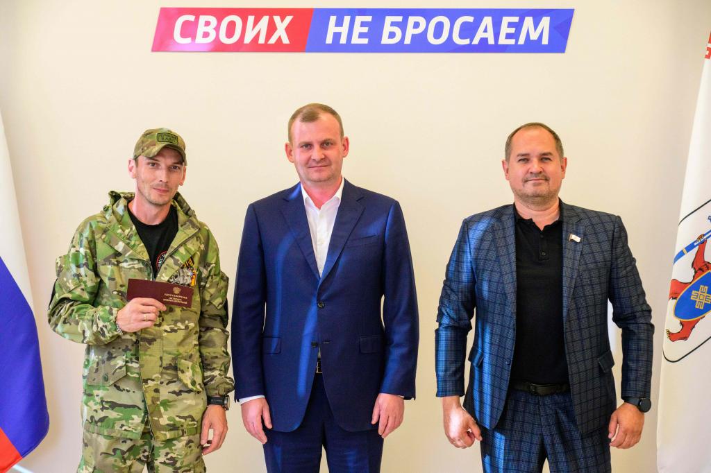 Евгений Курмаев, первый зампред правительства республики, и Ренат Магсумов, руководитель филиала «Защитники Отечества», вручили удостоверения ветерана боевых действий пятерым участникам специальной военной операции.