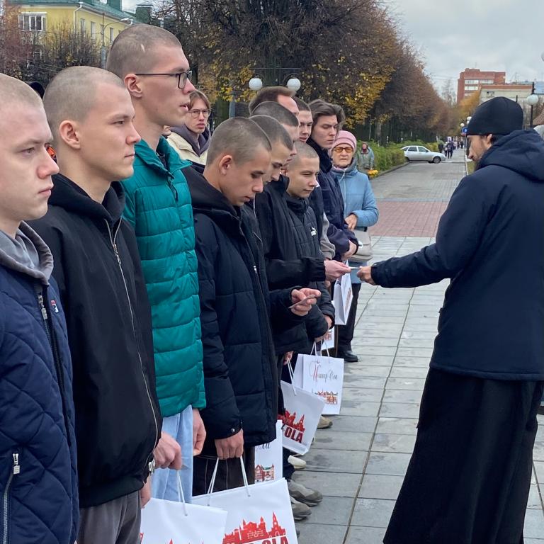 С напутственным словом к новобранцам обратился и священнослужитель храма Преподобного Серафима Саровского, иерей Николай. Он благословил ребят на успешную службу на благо Отечества и вручил им иконы архангела Михаила.
