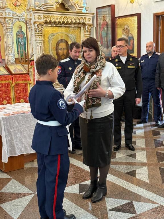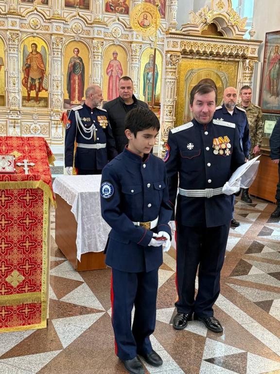 Юные кадеты принесли клятву, а иерей Андрей Кочаков, настоятель храма и духовник хутора, окропил новоиспечённых казачат святой водой, напутствуя их благословением на верное служение Отечеству.