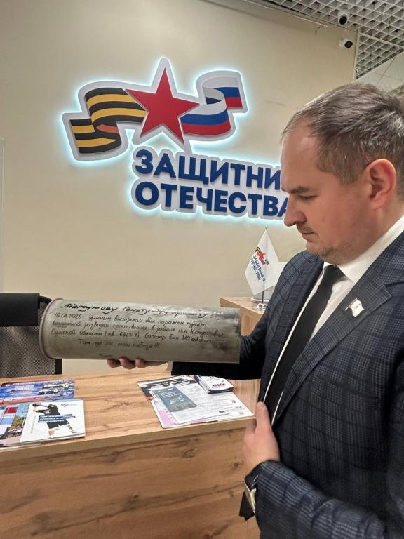 — Наши земляки передали мне гильзу. Причём непростую. 16 августа 2025 года выстрелом был поражён пункт воздушной разведки противника в районе населённого пункта Кондратовка Сумской области, — рассказал Ренат Магсумов.
