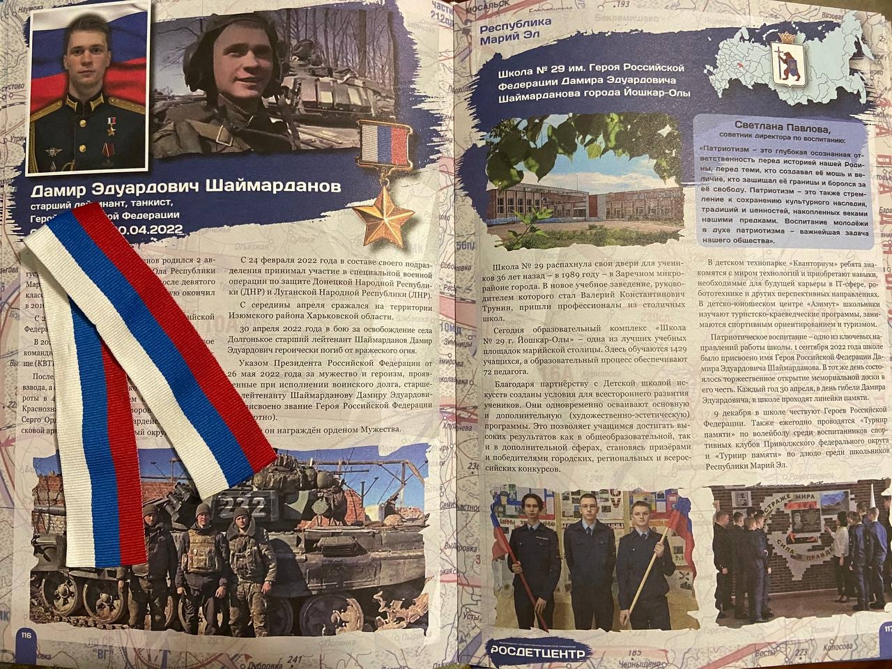 В издании собраны материалы о военнослужащих, чьи имена теперь гордо носят образовательные организации страны. Марий Эл представлена йошкар-олинской школой № 29, которая названа в честь Героя России Дамира Шаймарданова.