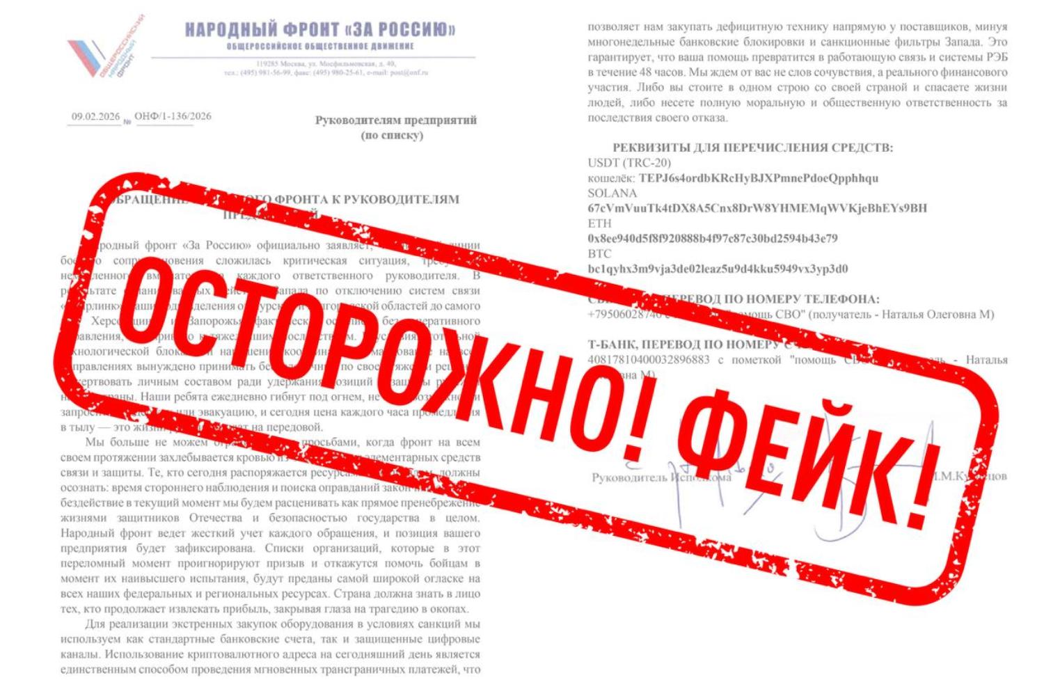 В сети интернет появился очередной фейк. От имени Народного фронта мошенники сделали эмоциональную рассылку по организациям, корпорациям, бизнесу с призывом пожертвовать средства «на помощь СВО».