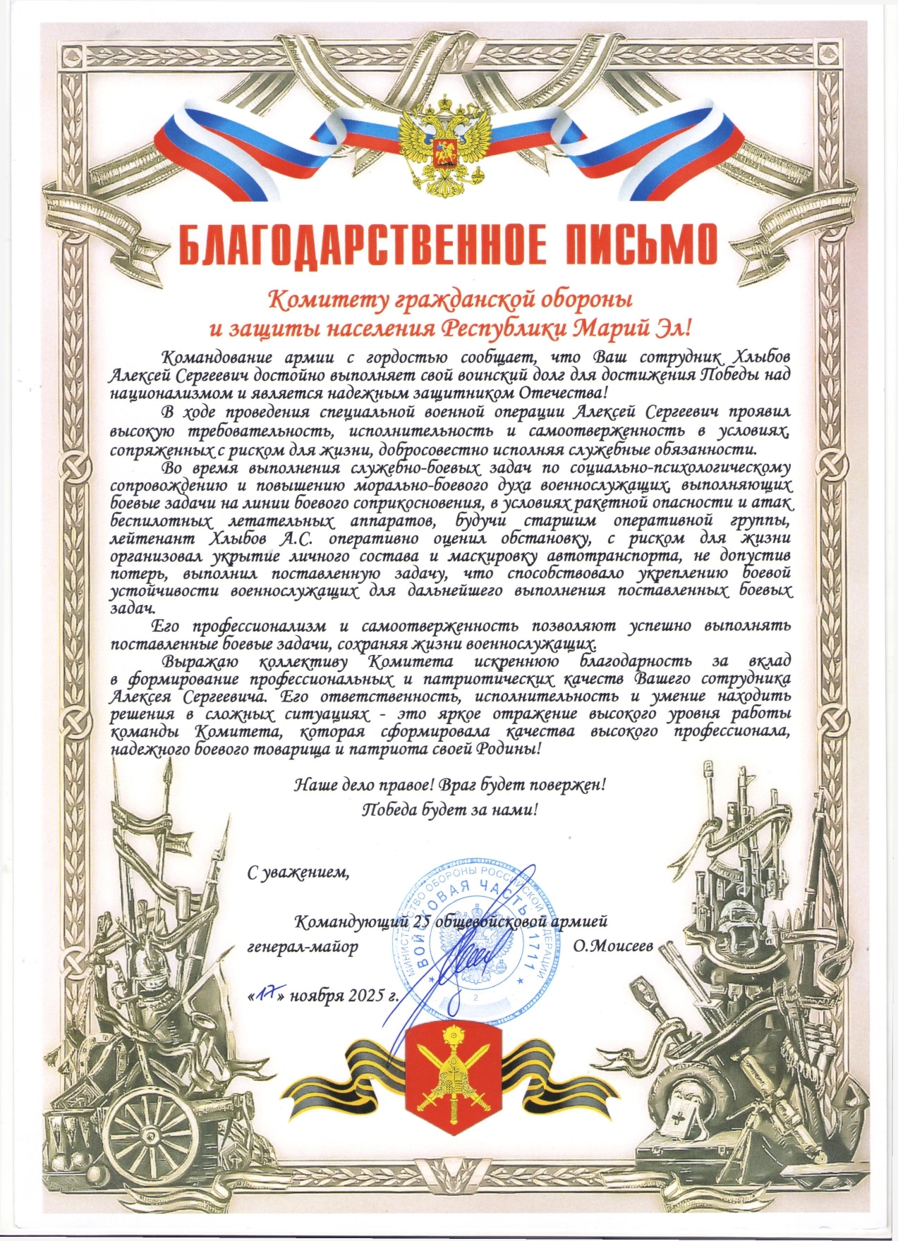 «Выражаю коллективу Комитета искреннюю благодарность за вклад в формирование профессиональных и патриотических качеств вашего сотрудника Алексея Сергеевича. Его ответственность, исполнительность и умение находить решения в сложных ситуациях — это яркое отражение высокого уровня работы команды Комитета, которая сформировала качества высокого профессионала, надежного боевого товарища и патриота своей Родины!».