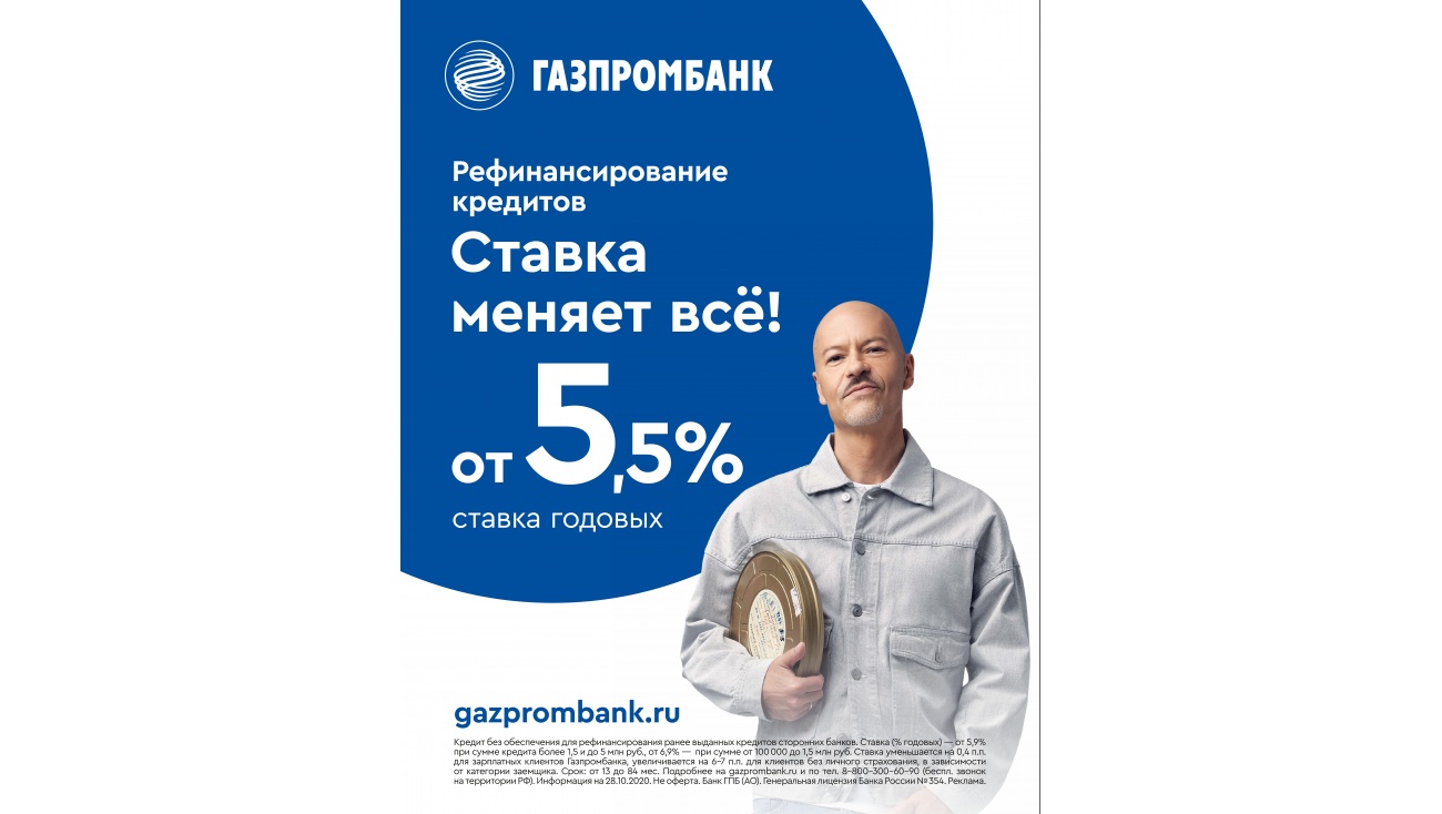 *Кредит без обеспечения для рефинансирования раннее выданных кредитов сторонних банков. Ставка (% годовых) — от 5,9% при сумме кредита более 1,5 и до 5 млн. руб., от 6,9% — при сумме от 100 000 до 1,5 млн. руб. Ставка уменьшается на 0,4 п.п. для зарплатных клиентов Газпромбанка, увеличивается на 6-7 п.п. для клиентов без личного страхования, в зависимости от категории заемщика. Срок: от 13 до 84 мес. Подробнее на gazprombank.ru и по тел. 8-800-300-60-90 (беспл. звонок на терр. РФ). Банк ГПБ (АО). Генеральная лицензия Банка России № 354.