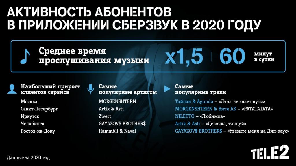 Tele2 проанализировала активность абонентов в приложении СберЗвук в 2020 году. Самыми популярными исполнителями по количеству прослушиваний стали MORGENSHTERN, Artik & Asti и Zivert. В среднем пользователи приложения слушают музыку по часу в день.