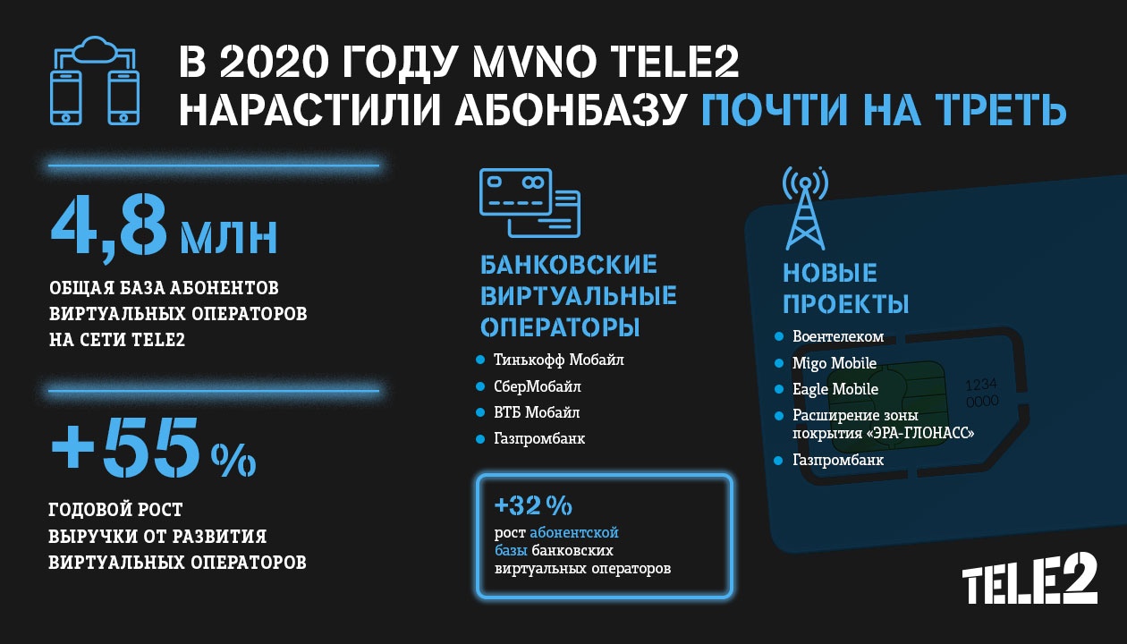Драйвером развития направления MVNO стали банковские виртуальные операторы: доходы от их работы увеличились на 73% год к году, а абонентская база показала рекордный для стагнирующего рынка рост на 32%. Все банковские операторы в России работают на сети Tele2. В конце 2020 года тройка банковских MVNO («Тинькофф Мобайл» (ООО «Тинькофф Мобайл»), «СберМобайл» (ООО «Сбербанк-Телеком») и «ВТБ Мобайл» (ООО «ВТБ Мобайл»)) пополнилась еще одним проектом: своего виртуального оператора на сети Tele2 создал «Газпромбанк» (Акционерное общество).