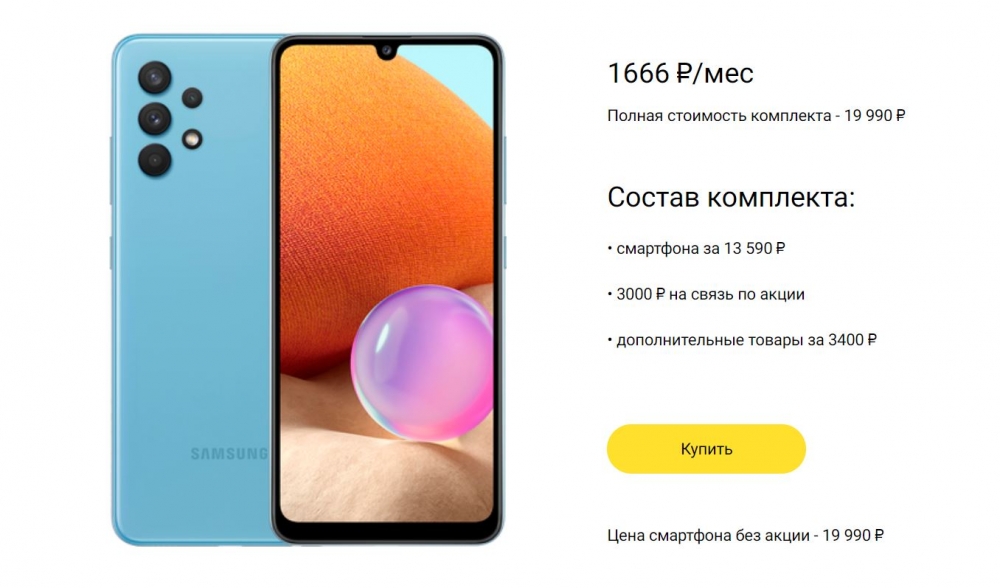 Приобрести можно как готовый комплект, так и составить его самостоятельно. Например, в акционный комплект вместе с популярным смартфоном Samsung Galaxy А32 64 ГБ входит тариф «Близкие люди 2», опция «3 000 рублей на связь по акции» на полгода, аксессуары на сумму 3 400 рублей или другие девайсы и услуги на выбор. Среди них: детские часы, услуга «Защита экрана», подписки «4в1», more.tv или START в составе сервиса «Билайн ТВ» (12+) на полгода. Общая стоимость комплекта составит 19 990 рублей или же всего 1666 рублей в месяц при условии покупки в кредит на 12 месяцев.