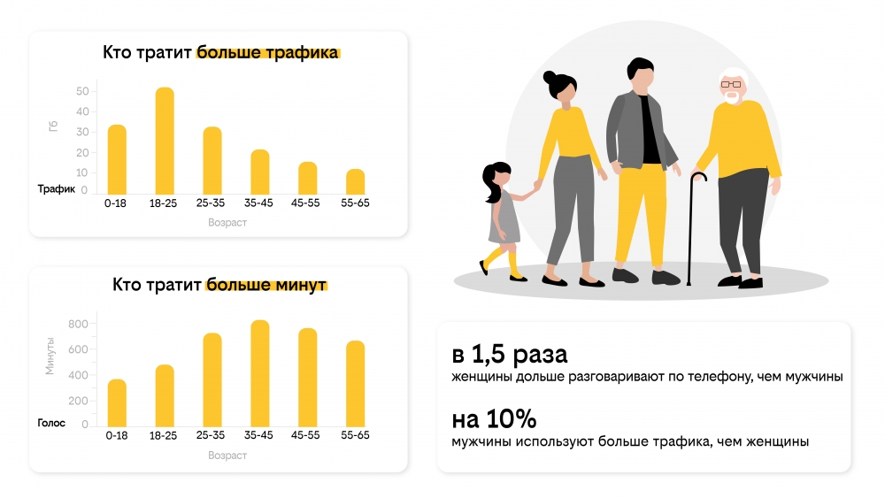 При этом по телефону старшее поколение разговаривает почти на 70% больше детей и на 40% больше студентов. Лидером же по количеству использованных минут в месяц стала возрастная категория абонентов 35–45 лет, а меньше всего говорят по телефону дети до 18 лет. Интересно, что в среднем женщины пользуются голосовой связью в 1,5 раза больше, чем мужчины.