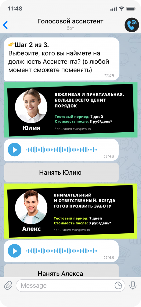 Клиент может самостоятельно выбрать персонажа, который будет отвечать на звонки. Каждый из ассистентов харизматичен и отличается своей манерой общения. Например, Юлия — вежливая и пунктуальная, ведет диалог в деловом стиле и больше всего ценит порядок. Алекс — внимательный и ответственный, всегда готов проявить заботу.