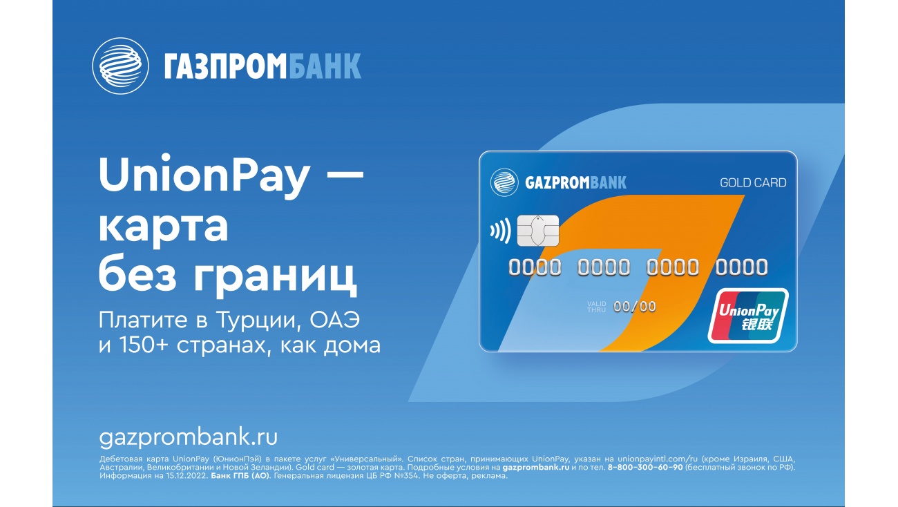 Газпромбанк начал выпускать кредитную карту 180 дней без % платежной системы UnionPay, которая позволяет оплачивать покупки не только в России, но и в странах ЕС, Турции, ОАЭ и еще 150 странах (полный список размещен на сайте UnionPay). С новой картой клиенты смогут не только оплачивать покупки картой, но и бронировать отели и арендовать автомобили для путешествий за рубеж. Среди преимуществ кредитной карты UnionPay — возможность снимать наличные по всему миру до 50 000 в рублевом эквиваленте без комиссии ежемесячно.