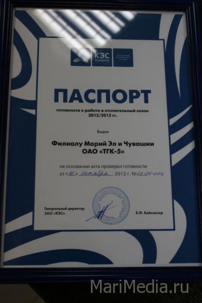 Филиал Марий Эл и Чувашии ОАО «ТГК-5» (входит в ЗАО «КЭС») своевременно получил паспорт готовности к работе в осенне-зимний период (ОЗП) 2012-2013 гг.