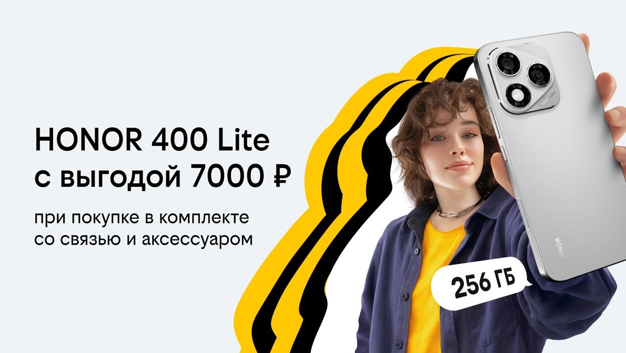 При покупке HONOR 400 Lite 256 ГБ в составе выгодного комплекта в интернет-магазине Билайна клиент получает выгоду 7000 рублей (6000 бонусных рублей на связь и защитное стекло стоимостью 1000 рублей). А совершая покупку в офисах обслуживания Билайна, вместо защитного стекла можно выбрать различные товары — умные часы или колонки, подписки на книги билайн и облако билайн, настройки, услуги и другое.