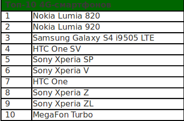 В августе 2013 года Топ-10 наиболее продаваемых 4G-смартфонов (в штучном выражении) выглядел вот так: