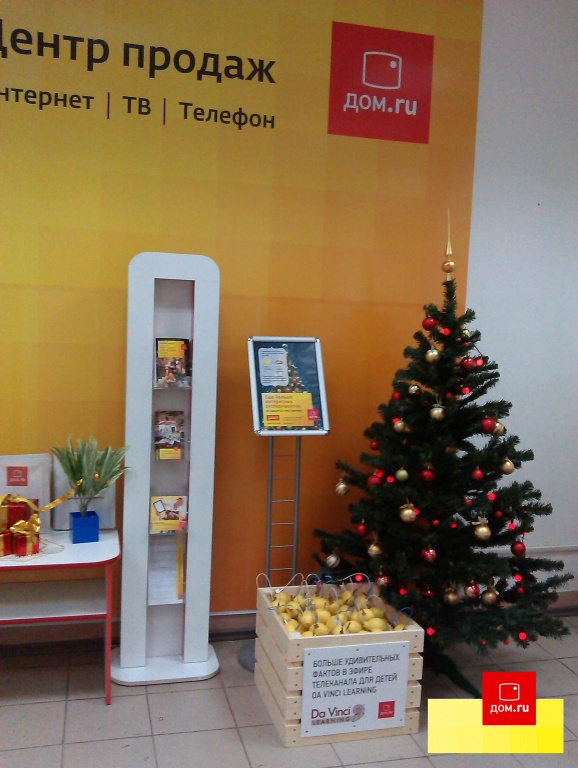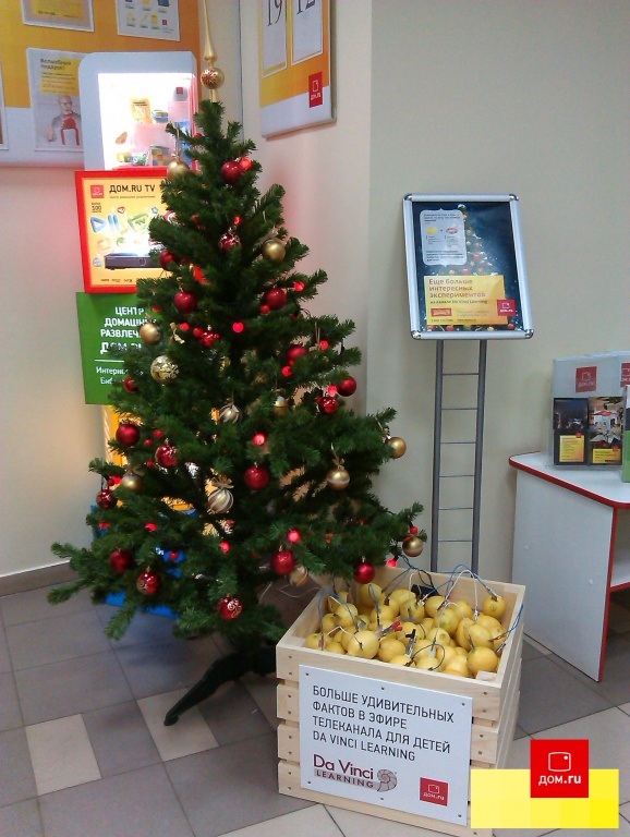 С 20 декабря по 15 января Абоненты «Дом.ru» в Йошкар-Оле увидят уникальную новогоднюю ёлку. Ее гирлянда заряжается за счет лимонов, вырабатывающих электрический ток! Лимонные ёлки установлены в Центрах продаж г. Йошкар-Ола по адресам: б-р Чавайна, 16 (ТЦ «Мегаполис», отдельный вход), ул. Строителей, 25 Б. Каждый посетитель Центров продаж сможет получить подарки от телеканала и Дом.ru.