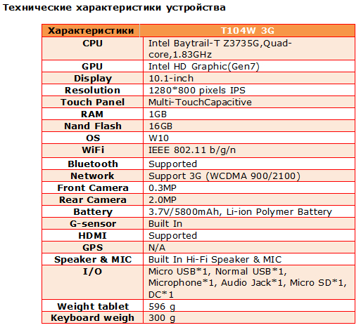 Модель T104W 3G оснащена мощным 4-ядерным чипсетом Baytrail-T Z3735G от Intel с частотой 1,83 ГГц и оперативной памятью 1 Гб, что обеспечивает высокую производительность устройства. Яркий 10-дюймовый IPS экран с разрешением 1280*800 пикселей отличается высоким качеством картинки и чувствительностью сенсора. Две камеры, тыловая и фронтальная (2 и 0,3 Мп соответственно) дают возможность снимать фото и видео. Для хранения учебной литературы, фотографий, видеофайлов и музыки предусмотрена встроенная память 16 Гб, которую можно увеличить до 32 Гб при помощи карт microSD. Литий-ионная батарея емкостью 5800 мАч позволяет устройству работать долгое время без подзарядки.