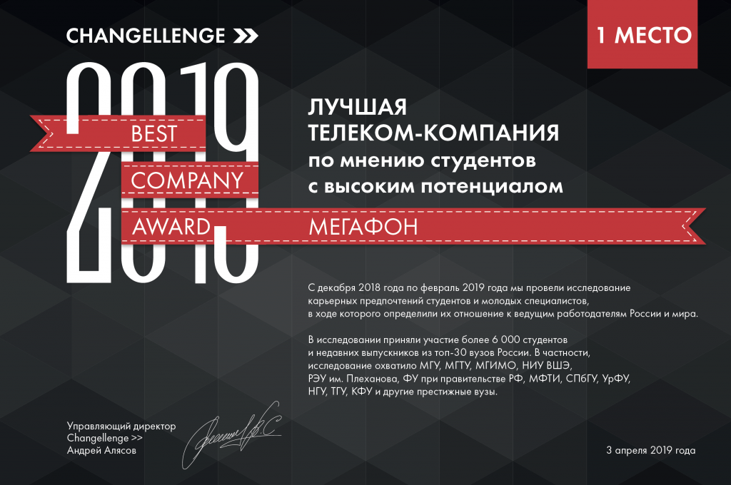 МегаФон занял первое место в номинации «Лучшая телекоммуникационная компания по мнению студентов с высоким потенциалом» в рейтинге Changellenge «Best Company Award».