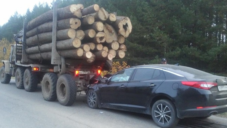 По предварительным данным, водитель иномарки не выбрал безопасную дистанцию до ехавшего впереди лесовоза. В итоге Kia вошла под прицеп «Урала».