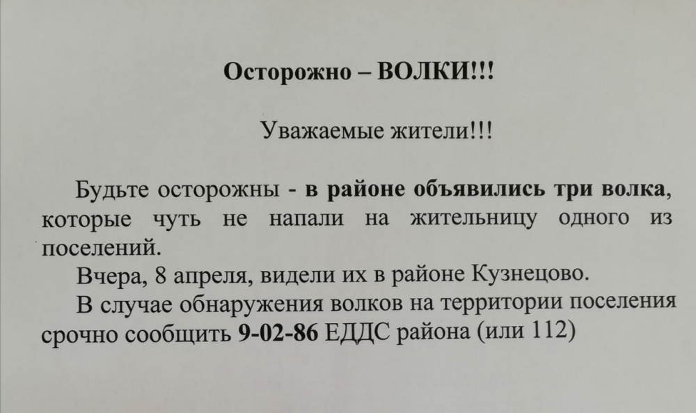Администрация просит местных жителей, встретив волков на территории поселения, незамедлительно звонить в Единую дежурно-диспетчерскую службу по телефону