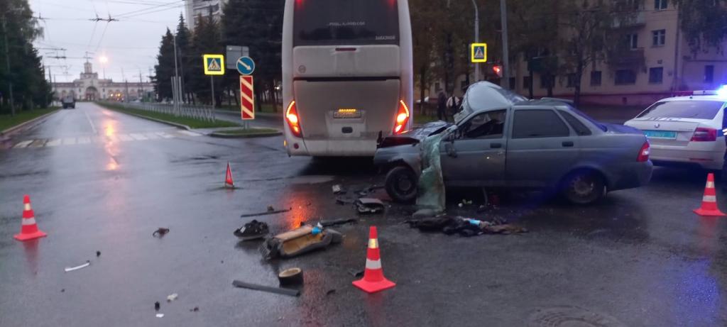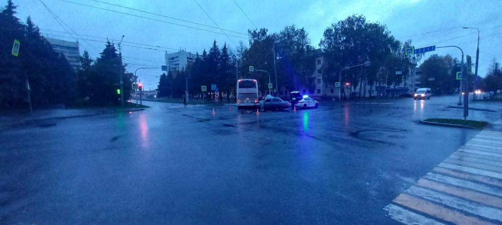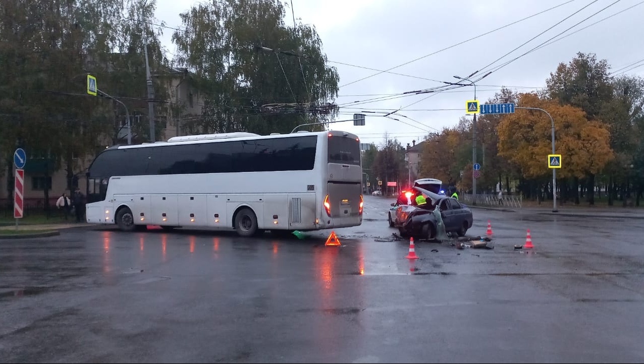 Сегодня около 04:40 на ул. Советской произошло столкновение пассажирского автобуса и автомашины Lada Priora.