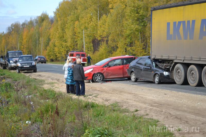 По информации пресс-службы МВД по Марий Эл, сообщение о крупном дорожно-транспортном происшествии поступило в дежурную часть около 8:00 воскресенья. Как мы сообщали ранее, на 2 км автодороги Кокшайск - Красногорский столкнулись, по уточненным данным - не 11, а 13 автомашин: 1 грузовик с полуприцепом, 4 автобуса и 8 легковых автомобилей.