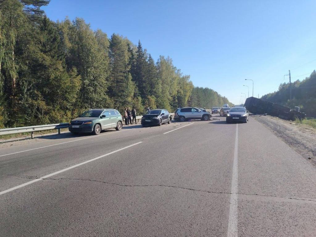По информации ГАИ, на трассе столкнулись четыре легковых автомобиля и один грузовик. Есть пострадавшие, в том числе несовершеннолетние.