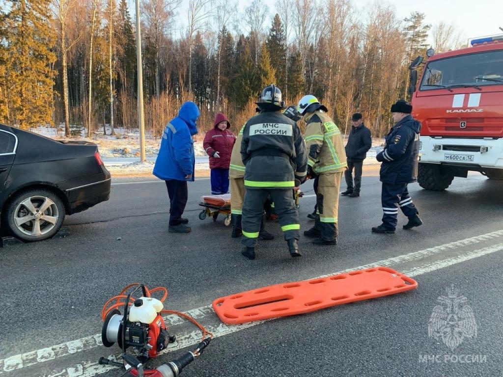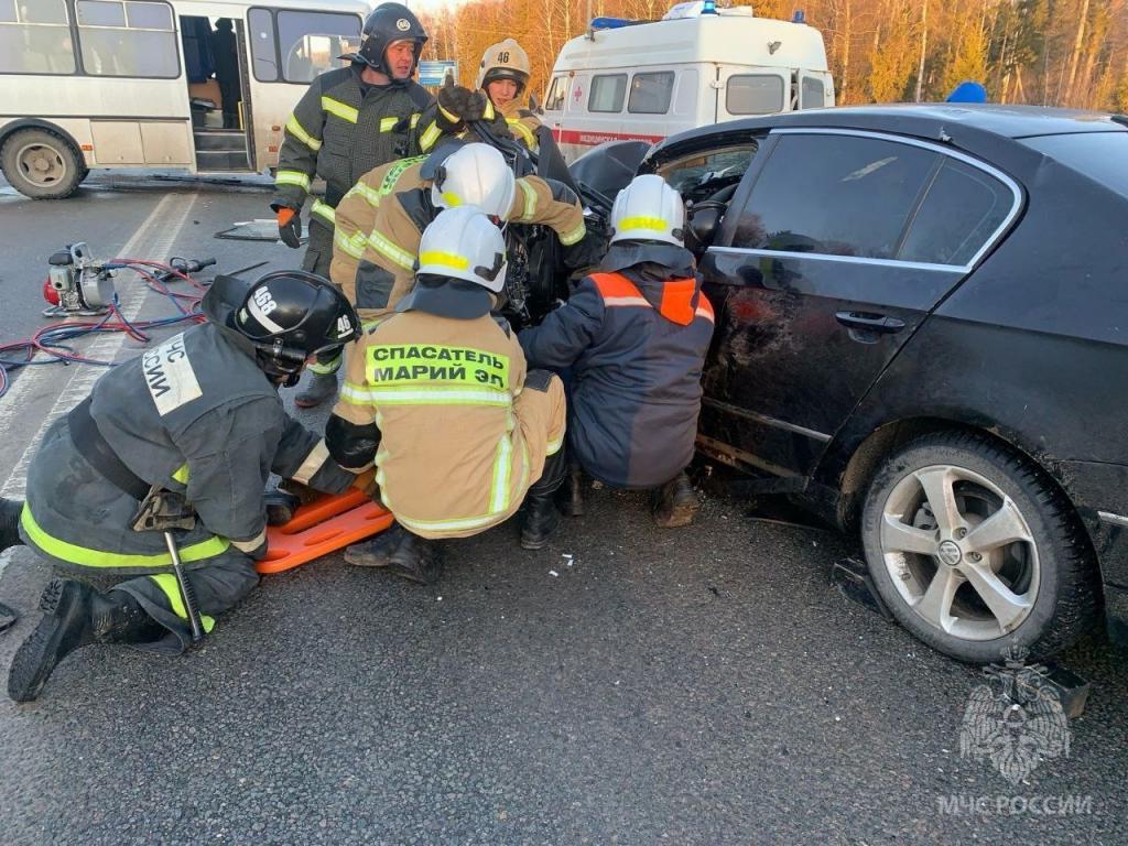 Спасателями Марийской аварийно-спасательной службы совместно с сотрудниками МЧС России деблокирован водитель иномарки. У него серьёзные травмы.
