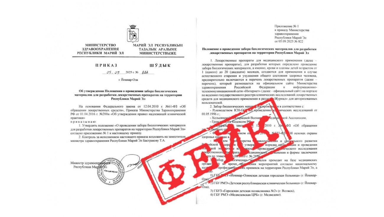 В интернете появился фальшивый приказ Министерства здравоохранения региона об утверждении Положения о проведении забора биологических материалов для разработки лекарственных препаратов на территории Республики Марий Эл.