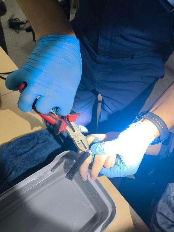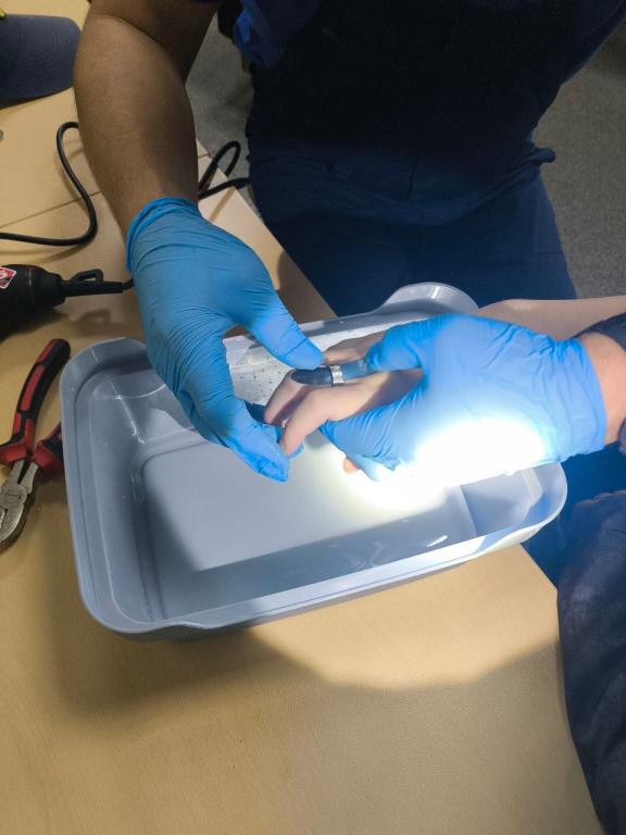 Пришлось немного повозиться, но парнишка держался, отмечают в МАСС. Кольцо снято, палец и рука в полном порядке.
