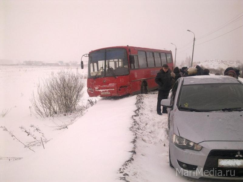 МариМедиа, 11 января. ДТП произошло сегодня днем на выезде из поселка Данилово. По словам очевидцев, Mitsubishi пошла на обгон рейсового автобуса, следовавшего из Ежово в Йошкар-Олу, и в сложных погодных условиях автобус занесло. Правое переднее колесо «Столицы» повисло над обрывом. Водитель автобуса не допустил съезда машины в кювет.