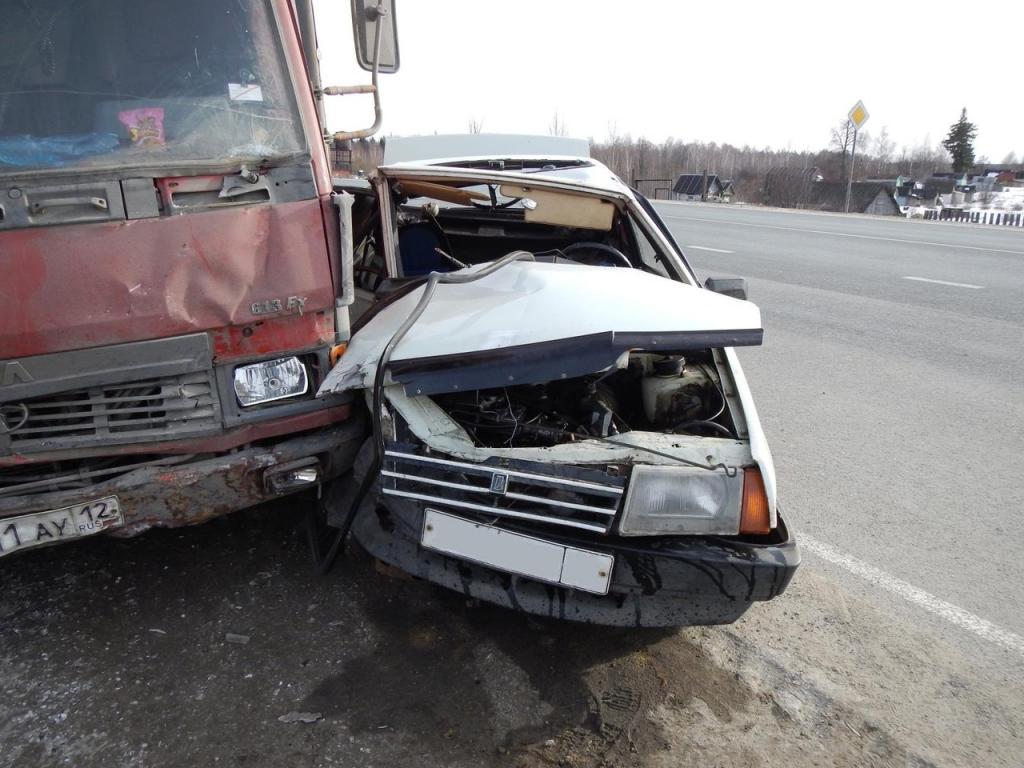 Авария произошла днём на 63 км автодороги Йошкар-Ола — Зеленодольск. Пьяный 48-летний житель Звениговского района, управляя автомашиной «ВАЗ-21099», при повороте налево не уступил дорогу грузовику, протаранив машину. В ДТП пострадал нарушитель и пассажир легковушки. Мужчины с черепно-мозговыми травмами, ушибами и переломами помещены в городскую больницу Волжска, сообщили в УГИБДД МВД.