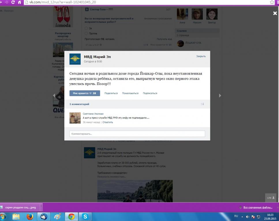 МариМедиа, 23 сентября. Сегодня в социальных сетях появилась информация, что этой ночью «в родильном доме города Йошкар-Олы, пока неустановленная девушка родила ребёнка, оставила его, выпрыгнув через окно первого этажа унеслась прочь». В пресс-службе МВД по Марий Эл, эту информацию не подтвердили. Сообщив, что заявлений о данном инциденте в правоохранительные органы не поступало. Непосредственно в приемной главного врача Перинатального центра Йошкар-Олы, эту информацию опровергли, сообщив, что ничего подобного в больнице сегодня ночью не происходило.
