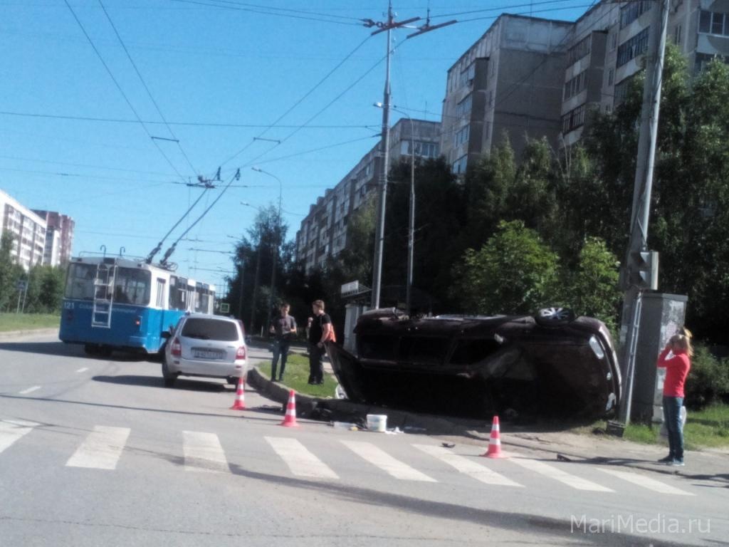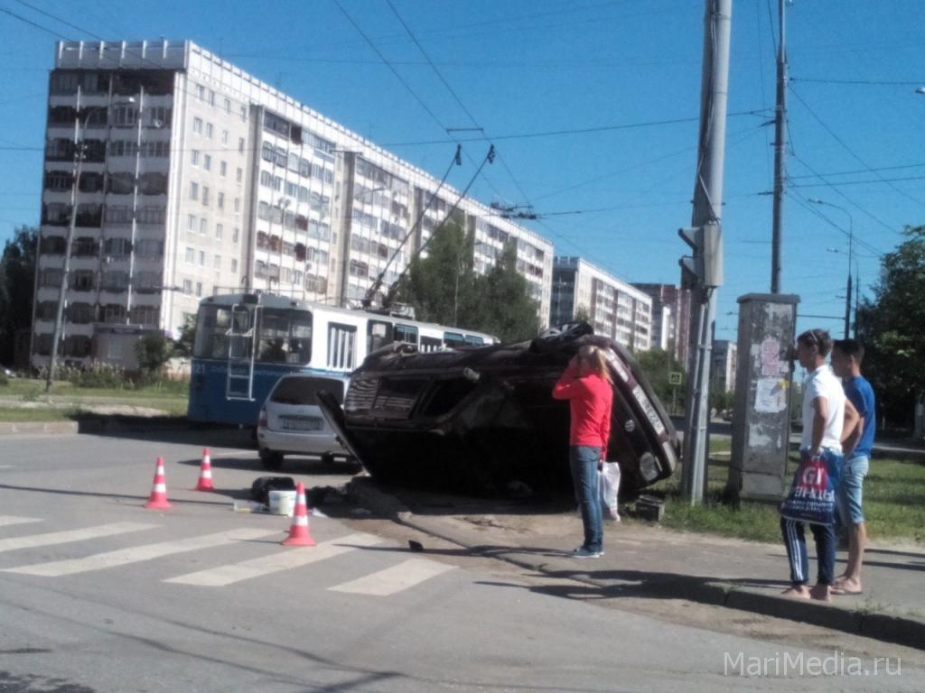 МариМедиа, 6 июля. Авария на перекрестке произошла в 5:20. Volkswagen Golf 3 перевернулся и лег практически на крышу.