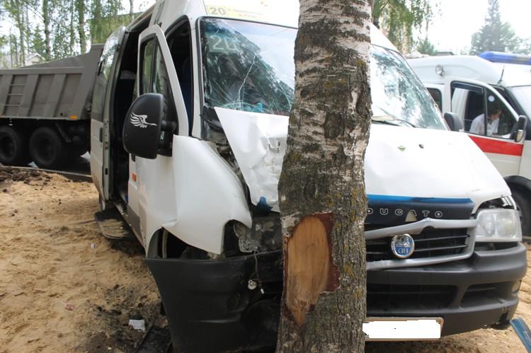 Водитель маршрутного такси уходя от столкновения с «КамАЗом» врезался в дерево. По предварительной версии, инспекторам ГИБДД предстоит разобраться в деталях ДТП, но есть предположение, что аварию спровоцировала другая легковая машина, двигавшаяся перед грузовиком.