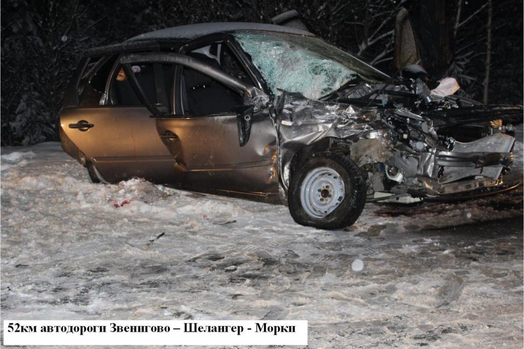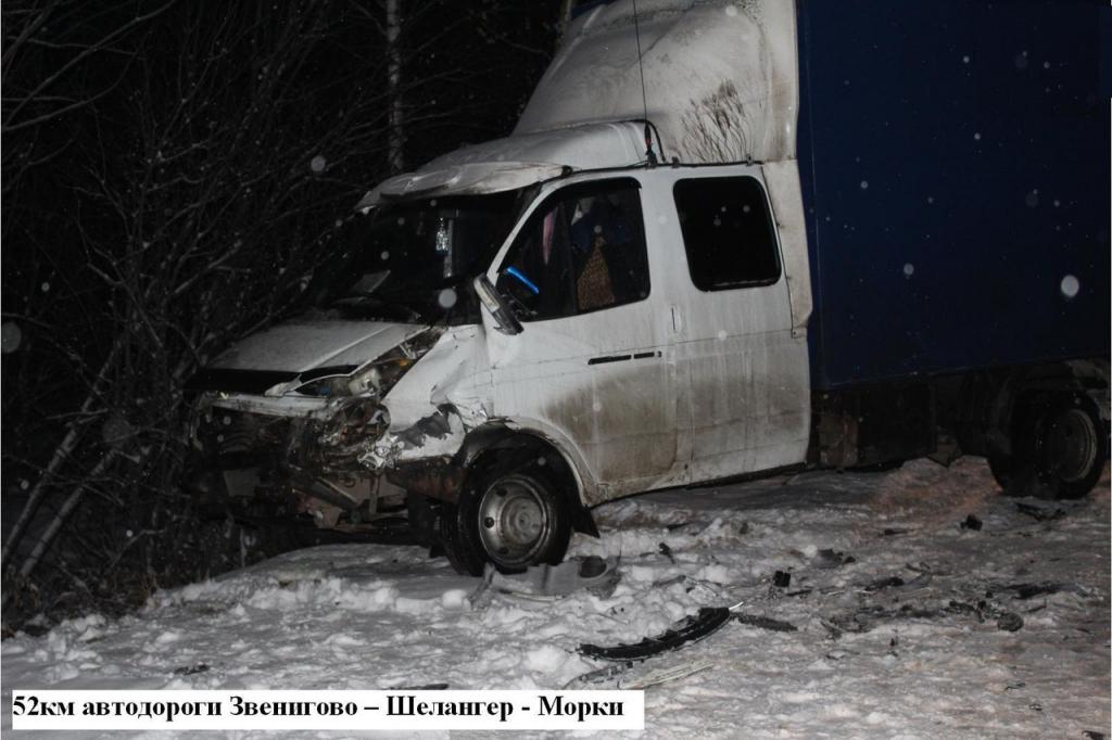 Пятничным вечером крупное дорожно-транспортное происшествие произошло на 52 километре автодороги Звенигово — Шелангер — Морки. Одна из причин — сложные дорожные и метеорологические условия. ВАЗ-2112, за рулем которого находился 23-летний водитель, выехал на полосу встречного движения. Здесь произошло столкновение с ВАЗ-2190 под управлением 52-летнего водителя. После этого «Ладу Гранту» вынесло на «встречку», где она врезалась в «Газель». В результате аварии пять человек (два водителя и три пассажира) доставлены в больницу.