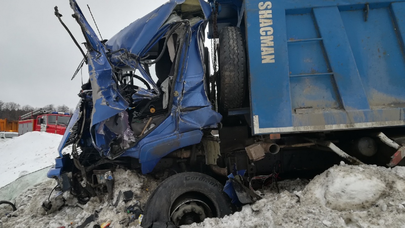 На трассе столкнулись грузовой автомобиль Shacman и КамАЗ. 41-летний водитель Shacman был заблокирован в кабинете, водитель КамАЗа не пострадал.