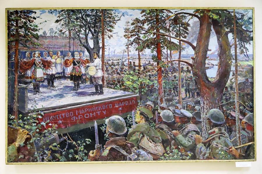 В понедельник, 22 июня, в День памяти и скорби в Республиканском музее изобразительных искусств состоялось открытие выставки «Человек на войне», приуроченной к 75-летию Великой Победы и Году памяти и славы в Российской Федерации. Как рассказали в пресс-службе регионального Минкультуры, выставка «Человек на войне» состоит из четырёх тематических разделов: начало войны, боевые действия, тыл и война глазами марийских художников. На выставке представлены живописные полотна Измаила Ефимова, Зосима Лаврентьева, Бориса Тарелкина, Евгения Яранова. Кроме того, в выставочном зале можно увидеть оружие, обмундирование советских солдат, образцы военных наград, фотографии непосредственных участников событий тех лет.